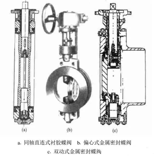 核级蝶阀(图4)通常有3种结构,同轴直连式衬胶蝶阀、偏心式金属密封蝶阀和双动式金属密封蝶阀。NI中蝶阀的口径从DN50~1200mm。其中同轴直连式衬胶蝶阀大多用于BNI中输送冷却水、生水和除盐水等介质的系统。由于的是橡胶软密封,压力低于150磅级,核级别一般均为3级,配置上手柄、蜗轮副、气动装置或电动装置可实现阀门的启闭或调节功能。金属密封蝶阀则常用在安全壳内输送空气介质的系统中。偏心式结构蝶阀是依靠蝶板回转到大偏心距时产生与阀体密封面的接触和压紧而实现关闭,由于存在相对的磨擦,密封面容易受磨损,而且对加工尺寸控制要求也较高。双动式蝶阀的结构是借助凸轮机构使蝶板在回转前先脱离与阀体密封面的接触,然后再回转90°,同时阀板上的密封面是一种特殊的带内支承的金属O形环,具有自密封能力,配有带弹簧复位的气动装置能可靠地实现紧急切断或排放介质的功能。